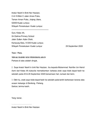 Institut pendidikan guru kampus raja melewar jalan sikamat 70400 seremban negeri sembilan darul khusus. Apabila anak tidak hadir ke sekolah kita perlu memberitahu guru kelas. Memohon cuti sekolah sehari untuk tujuan tertentu.
